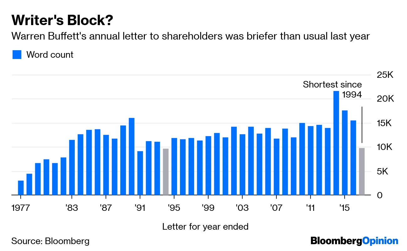 他的庞大投资工具,伯克希尔·哈撒韦公司,明天将发布他最新的年度股东信。塔拉·拉查佩尔指出,这封信最近在内容和长度上已变得无关紧要: