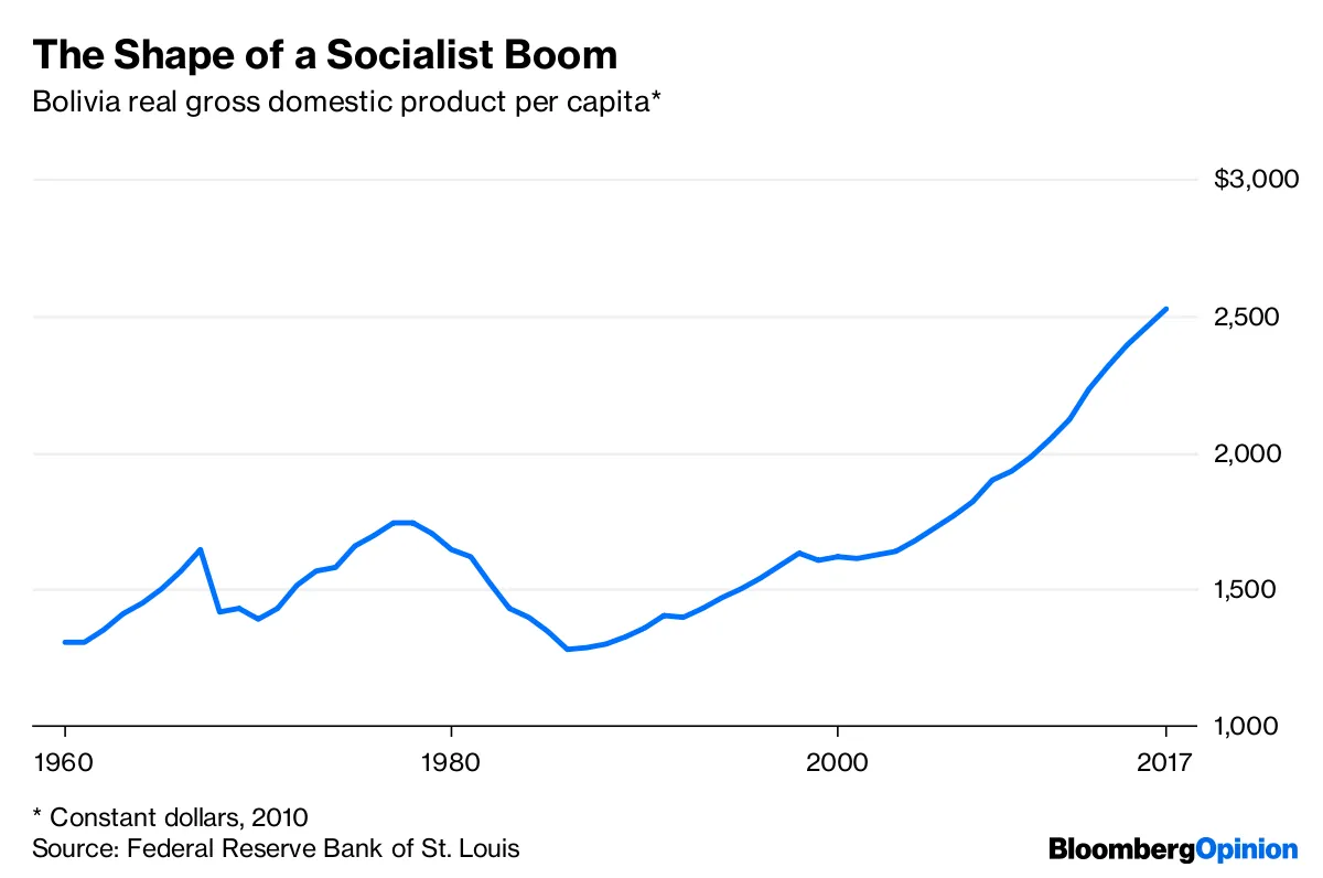 委内瑞拉也是特朗普和其他保守派的一个方便谈资,他们警告说,任何带有社会主义色彩的民主政策将使美国变成像委内瑞拉一样的经济灾难。但麦克指出,委内瑞拉更像是一个掠夺政权,而不是一个真正的社会主义国家。对于半球内的一个更好的例子,请看看玻利维亚,写道诺亚·史密斯。它的社会主义经济表现出色: