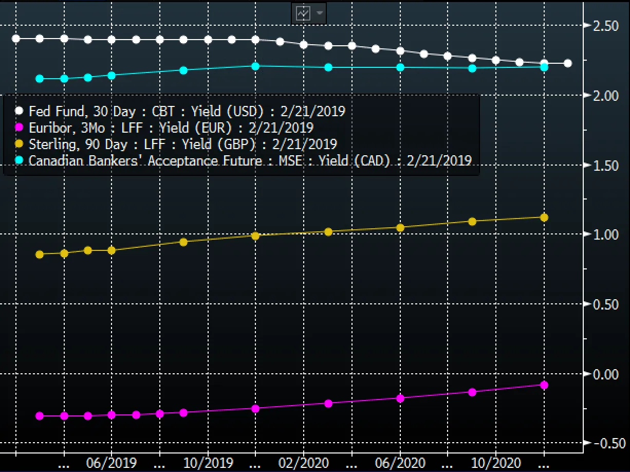 投资者面临的一个问题是,向上倾斜的欧元银行间拆借利率、加拿大银行承兑汇票和短期英镑期货曲线能与向下倾斜的联邦基金期货曲线共存多久?这种情况将如何解决?