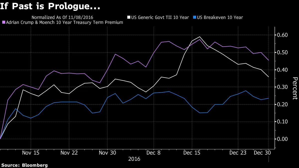 彭博社彭博社你可能还记得,那次胜利对美国债券来说在短期内是个坏消息,10年期盈亏平衡率、实际利率和期限溢价都在上升,因为投资者开始对由美国财政政策放松推动的同步全球增长感到兴奋。