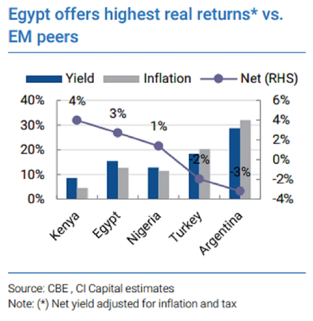 即使上周的意外降息——根据分析师的说法,进一步放松政策在即——似乎也不足以阻止投资者对埃及的长期投资,策略师认为,预期的实际回报相对于许多其他新兴市场国家仍然具有吸引力。