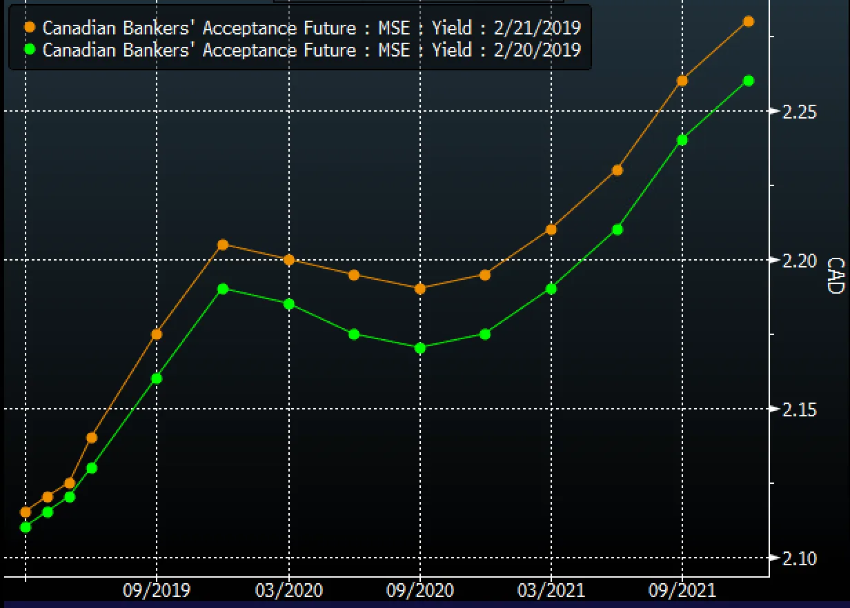用于判断加拿大央行政策收紧市场隐含可能性的银行承兑汇票期货曲线当天略微上升。