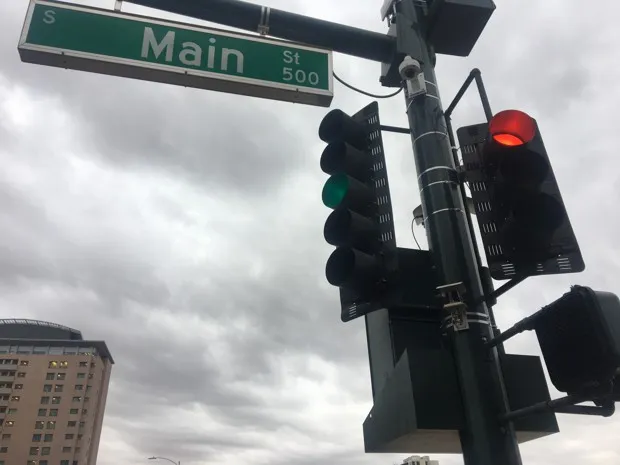 仔细看看:位于拉斯维加斯市中心的梅因街和克拉克街的这个交通信号灯上装满了传感器、摄像头和额外的公用设施箱,使“智慧城市”技术得以运行。劳拉·布利斯/城市实验室根据市领导的说法,这些只是过去几年中“智慧拉斯维加斯”项目组合中的数百个试点项目中的一部分。它们还包括去年在弗里蒙特街上下行驶的法国制造商Navya的自动驾驶穿梭车、基于需求的停车计费系统,以及让市民支付账单和拨打311的“GoVegas”移动应用程序。