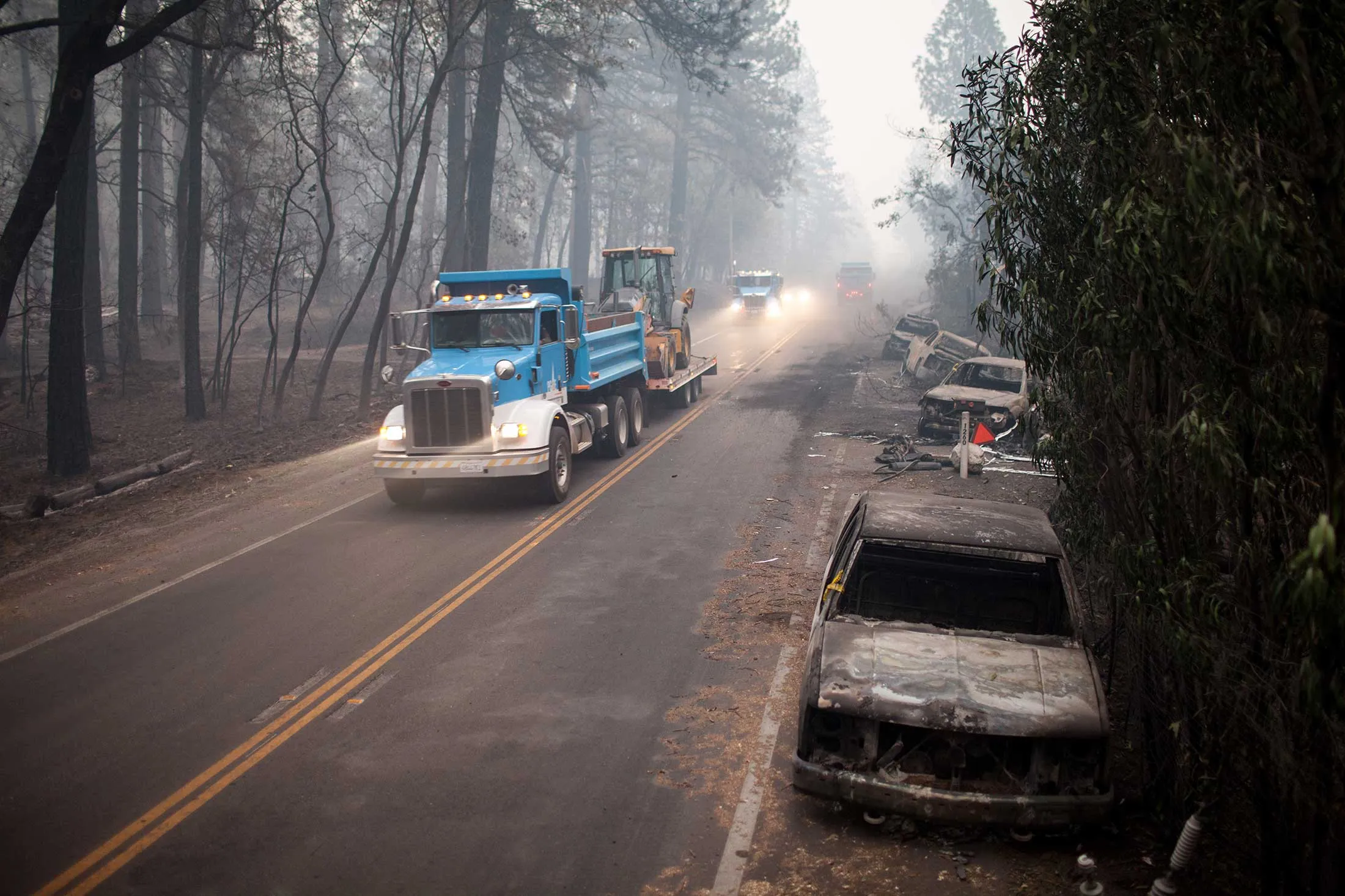 那天早上,梅森和另外两位故障处理员在公司位于奇科的院子里等待任务。大约在6:45,其他人被派去处理附近的跳蚤山的停电问题。稍后,梅森的老板打电话告诉他前往天堂,一个位于内华达山脉山脚的小镇,那里另一位同事需要帮助。梅森已经能看到烟雾,在路上他经过一辆辆朝相反方向行驶的汽车。在开车15英里的时间里,几英里外被发现的小火焰已经变成了一个被风驱动的、狂暴的怪物。当他刚到镇外时,火灾就来了。“我看到树顶开始旋转,”梅森说,“五分钟内就像是午夜——火来了,烟来了。”