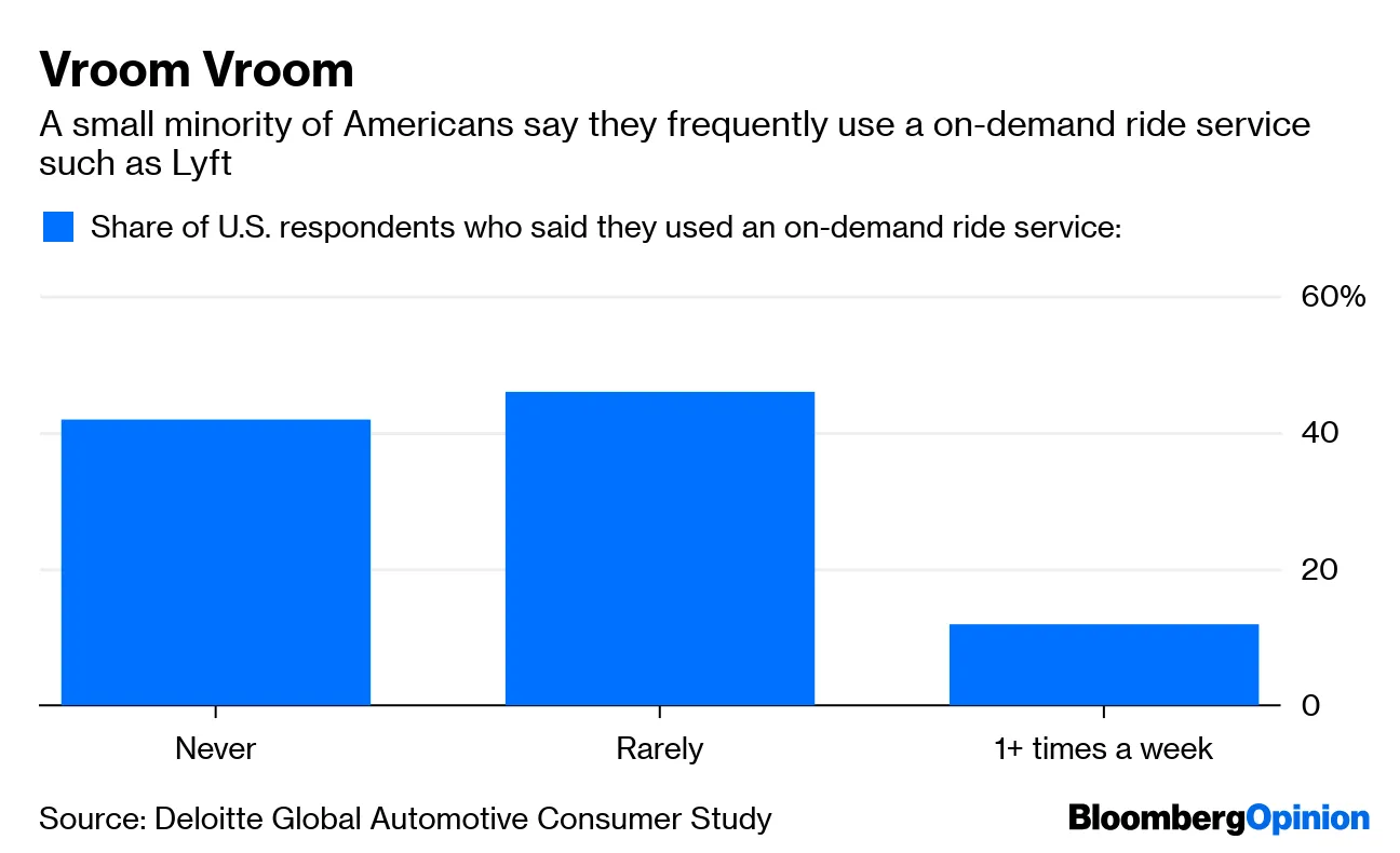 - Lyft的市场有多大? 使用此类应用程序的人群的微小比例表明,要么存在一个巨大的未开发市场,要么尽管他们的营销支出和票价补贴,天然需求并不大,Shira Ovide为彭博社观点撰文称。这些服务可能只是“一种由廉价资本驱动的幻影,使这些创新能够以大众可承受的价格实现。”