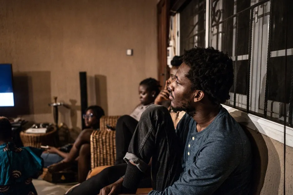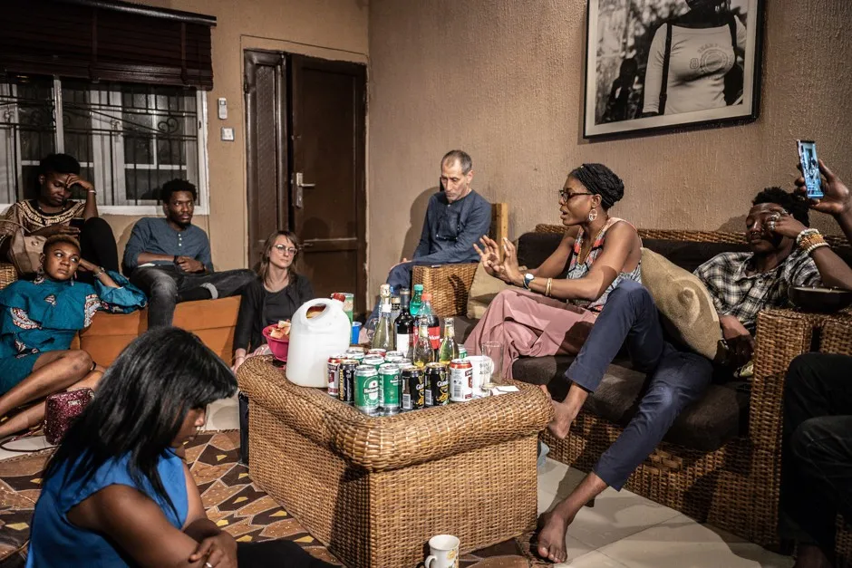 在靠近入口的橙色沙发上,投影屏幕的光线时不时照亮客厅。我身边坐着两位女性:来自纽约的艺术管理员Elizabeth和律师兼文学推广者Ijeoma。房间里传来几声窃笑,一个模糊的声音对着电影中的音乐唱回应,音乐听起来像《狮子王》生命之圈的祖鲁开场。