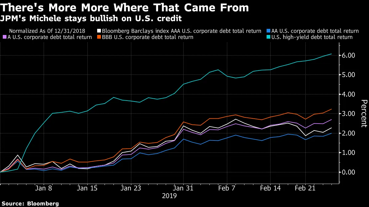 本周,两位摩根大通的高管谈到了经济背景和衰退风险,他们的观点截然不同。董事长兼首席执行官杰米·戴蒙表示,银行“已为衰退做好准备”,尽管他并不预测衰退,并且演示表明公司不会像以前那样快速增长其贷款组合,而是会专注于高质量的机会。资产管理部门的首席投资官鲍勃·米歇尔在彭博电视台的采访中则表达了相反的观点。他表示,即使在年初强劲回报之后,风险最高的投资级债务——BBB级债务和高收益信用仍然是很好的投资选择。“只要没有衰退的迹象——我们在未来几年内看不到衰退,而美联储的鸽派倾向无疑将周期推迟了一些——情况看起来相当不错,公司将能够偿还其债务,”他谈到BBB级债务时说道。这些对立的观点反映了企业财务主管与企业投资者之间在责任和优先事项上的差距。尽管企业债券并不是流动性最高的资产类别,但信用投资组合的灵活性远胜于银行资产负债表。杰米·戴蒙的立场就是为什么投资者对持有银行债务如此满意——金融机构仍然受到危机的影响,而资产负债表的质量在避免左尾结果方面始终是重中之重。鲍勃·米歇尔的观点则表明,投资组合经理如何在信用市场中赚钱,只要扩张持续下去。