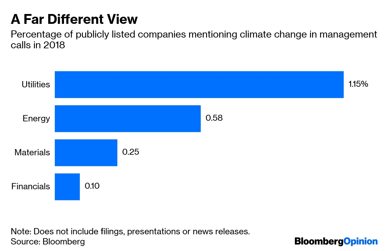 PG&E肯定不会是最后一家受到气候变化影响的公司,但到目前为止,无论是企业首席执行官还是他们在联邦储备银行的资助者似乎都没有意识到这些影响来得比预期更早,写道内森尼尔·布拉德。他在企业财报电话会议中寻找“气候变化”的提及,发现即使是明显受气候影响的行业,如公用事业(咳,PG&E,咳),也几乎没有提及: