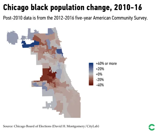 彭博社城市实验室芝加哥以冷静、派对和阳光克服了DNC怀疑者纳粹掩体的绿意改造将丑陋的过去变成城市的眼球吸引器圣保罗的Cortiços如何帮助庇护南美洲最大的城市仅使用公共交通的跨洲竞赛芝加哥独特的特点是连续三年人口减少。这一下降主要是由于非裔美国人人口的减少,非裔美国人人口自2000年以来下降了24%。尽管有很多黑人从芝加哥迁出,但城市内部也发生了一些变化:自2010年以来,芝加哥北区的几个社区——历史上大多数白人居住的地方——增加了黑人居民。这些北区社区是莱特福特在本周市长选举中表现最好的地方。