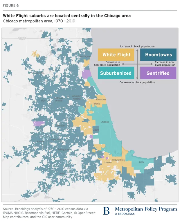 许多在芝加哥消失的黑人家庭最终落脚在周边的郊区——那些白人芝加哥人逃离城市的地方,而他们现在也在逃离这些地方。下面的地图来自最近的布鲁金斯学会报告,作为 布鲁金斯研究员安德烈·佩里的“黑人城市崛起”项目,显示了自1970年以来,芝加哥及其郊区的白人人口在减少,而郊区的黑人居民在增加。(尽管最近几年显示 芝加哥郊区现在也在失去黑人居民。)