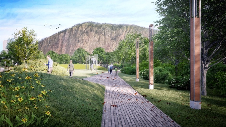 花园的计划反映了她们的愿望。两个入口将从一条繁忙的道路分支进入一个开放的景观区域,通向一个更安静、更偏僻的空间。沿途将用砖块标记受害者的年龄和死亡日期,追溯到1968年。(设计师选择1968年作为截止年份,因为那是一个重要的年份,而且在此之前的幸存者不太可能还活着,因此不太可能参与这个项目。)弯曲的花坛和供坐的台阶将提供岩石突起和河流的视野。