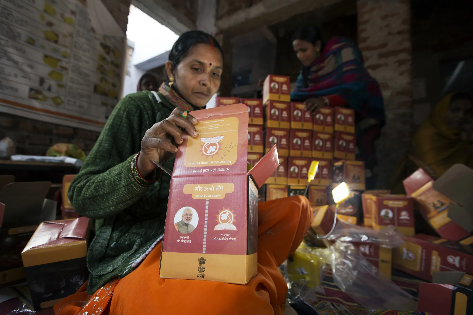 一名工人在一家通过政府贷款获得资金的企业包装太阳能灯。