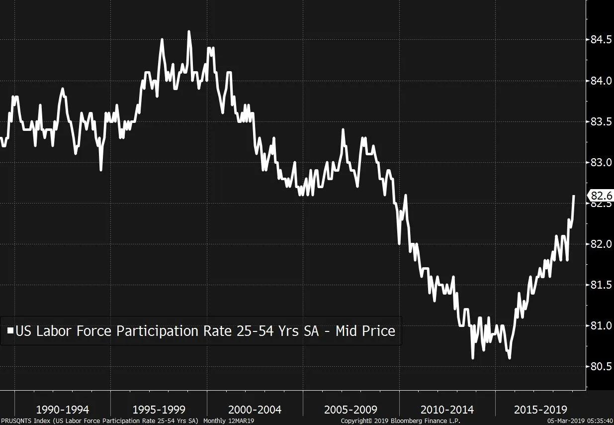 今天才星期二,但从来不早于开始期待星期五的非农就业报告。很长一段时间以来,精明的数据观察者的口头禅是,报告中值得关注的事情是工资数字,因为最终这将是衡量劳动力市场紧张程度的最佳指标,因此也将促使美联储加快加息步伐。但美联储最近几个月已经明确表示——在转向更耐心的立场时——它认为工资上涨的空间是存在的,而不一定会导致普遍的通货膨胀。因此,即使是温和的通胀数字也不必成为投资者焦虑的理由。听起来很无聊,但考虑到对经济增长放缓的担忧,这可能是关注二月份新增就业人数的好月份。经济学家预测将新增181,000个就业岗位。另一个需要关注的事情是适龄劳动力参与率。最近几个月这一比例一直在上升,但目前为82.6%,仍低于危机前水平,远低于90年代末的水平(当时达到84.6%)。这一比例越高,越表明劳动力市场仍然存在显著的闲置。