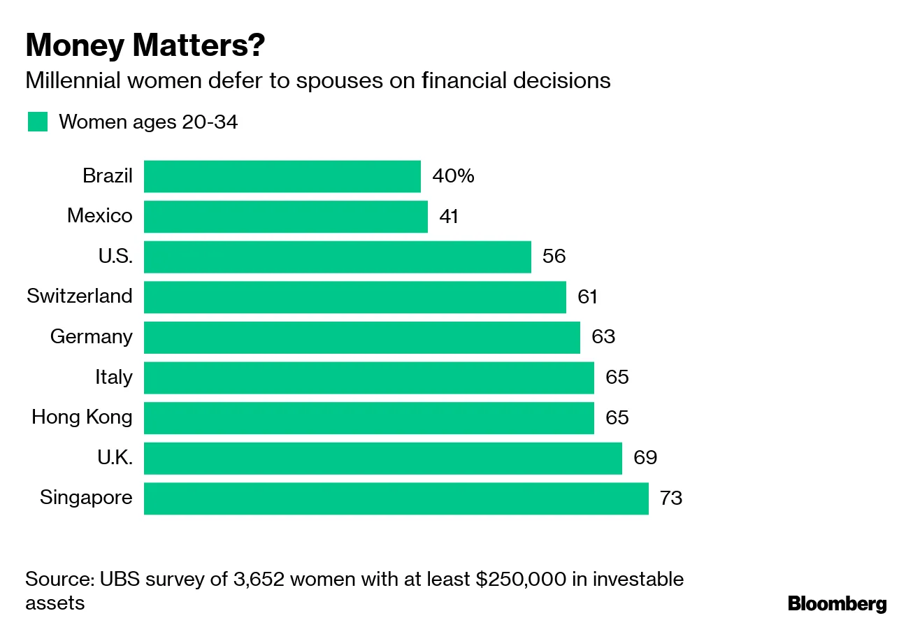 年轻已婚女性让配偶来处理她们的财务。根据瑞银的一项调查,近60%的受访者表示她们将财务规划留给配偶。“你会看到女性为平等权利和平等机会而奋斗,为在工作场所和家庭中获得尊重而努力。但一旦我们赚到钱并获得那些职位,我们在做什么呢?”该公司的账户副总裁玛丽埃尔·舒里格说。但绝大多数人仍然参与日常的财务事务,如支付账单和管理开支。