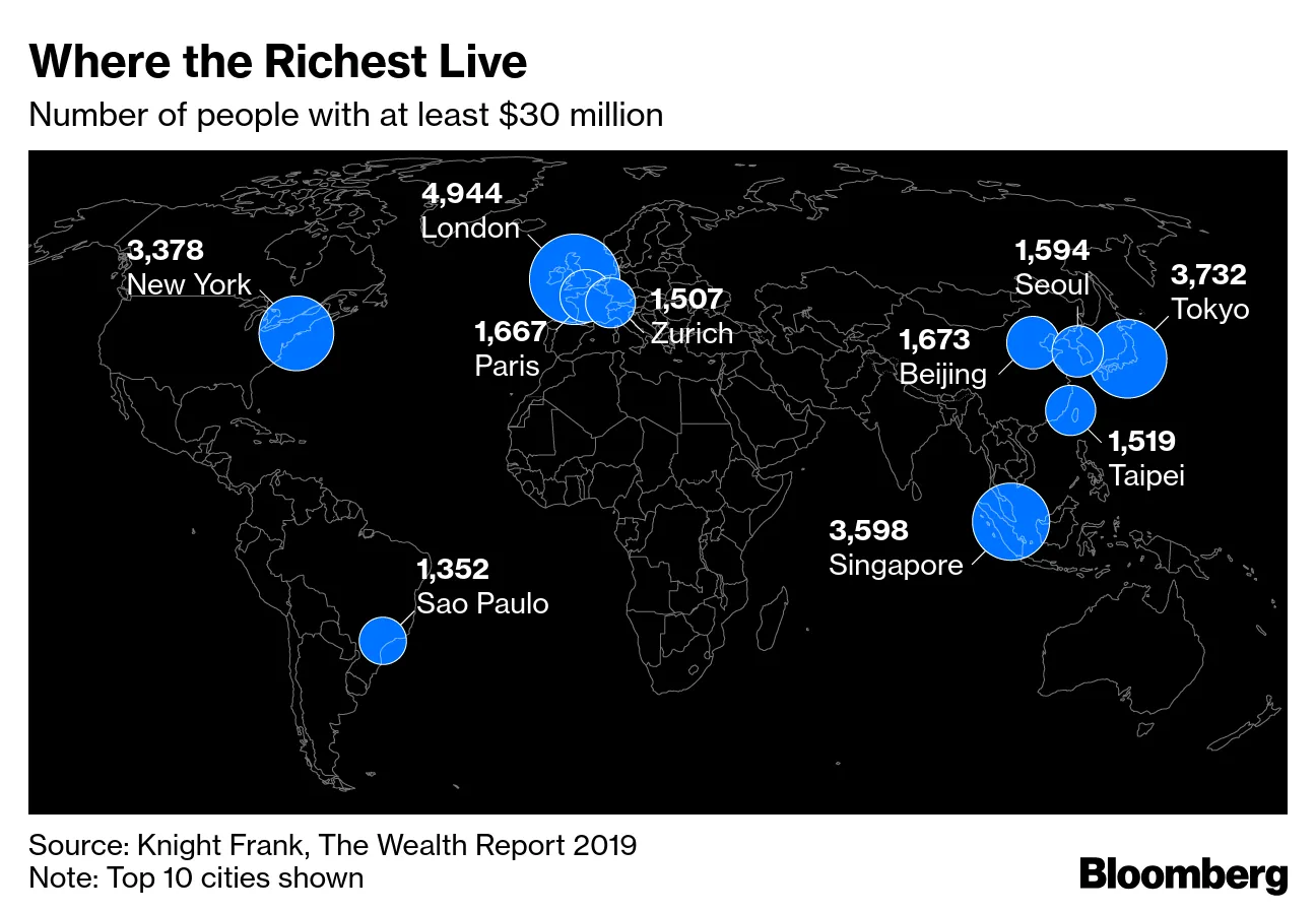 如果你在寻找世界上最富有的人, 那就去伦敦、东京和新加坡吧。这三个城市是 至少拥有3000万美元财富的最多人居住地,根据莱坊2019年财富报告。大约一半的这一精英人群的主要居住地集中在仅仅10个城市中,而其中只有一个在美国——纽约。