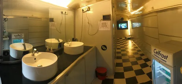 公交车的内部。除了厕所,每辆公交车还提供水槽、淋浴、卫生巾、饮用水和哺乳空间,并配有服务员。由Sara Plast Private Limited提供“这个想法是给女性她们应得的:安全和尊严。我们没有华丽的大理石地板,但我们正在建造的厕所是干净且质量良好的,”萨达尔卡尔说。“事实上,我们花了几个月的时间来说服这里的人们,公共厕所也可以是干净和安全的,打破了印度的传统观念。”