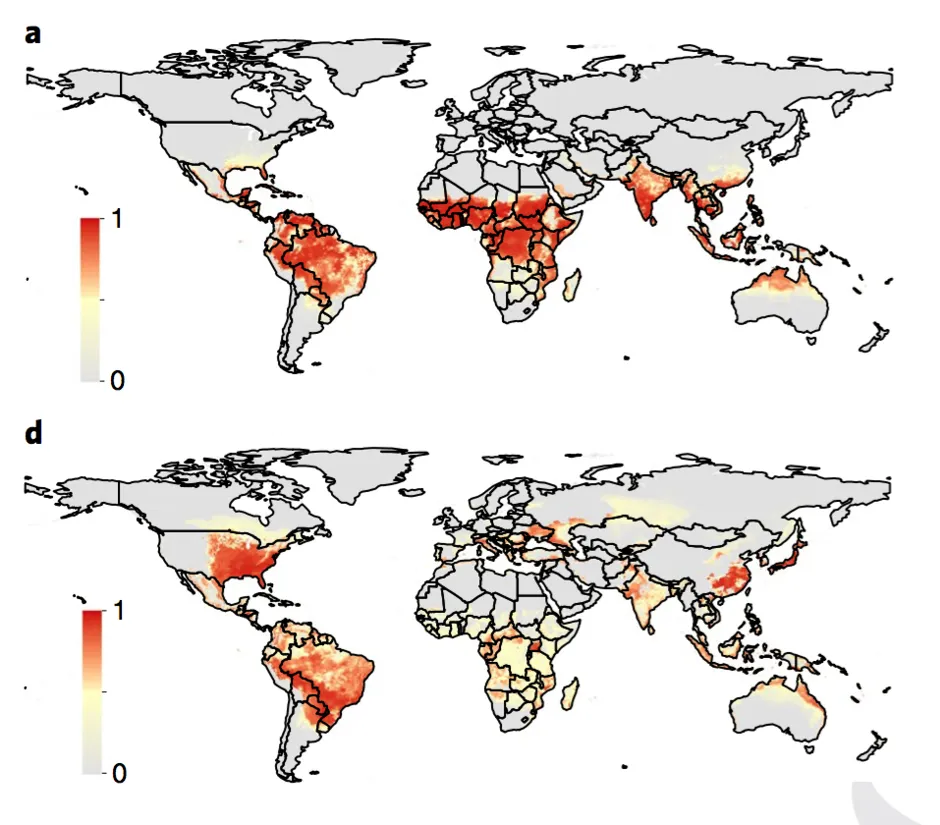 基于中等气候模型预测的埃及伊蚊(上)和亚洲虎蚊(下)的全球传播,排放量在2080年达到峰值。深红色阴影表示更高的预测流行率。自然微生物学至于亚洲虎蚊,它们倾向于在其种群已经建立的地区扩展,模型预测它们将遍布整个欧洲,覆盖法国和德国的大部分地区。在美国,模型预测它们也会向北建立栖息地。这种物种主要以动物为食,但已将基孔肯雅病毒、登革热和寨卡病毒传播给人类。到2080年,模型显示它们可以在197个国家被发现,其中有20个国家首次报告它们。