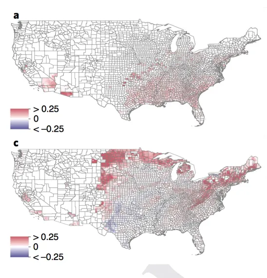 未来2050年由于气候变化和城市化导致的美国埃及伊蚊(上图)和亚洲虎蚊(下图)的传播地图。红色表示种群扩张,蓝色表示种群缩小。自然微生物学这些研究人员专门研究了 埃及伊蚊 和亚洲虎蚊(或 白纹伊蚊)的传播——这两种热带物种已成为寨卡、基孔肯雅和登革热等病毒的主要传播者——在17种气候变化情景下的表现。他们的预测模型结合了全球蚊子检测到的超过33,000个数据点,以及关于它们自1970年代和80年代起传播到欧洲和美国的历史数据,以及气候变化、人类迁移和城市增长的预测。