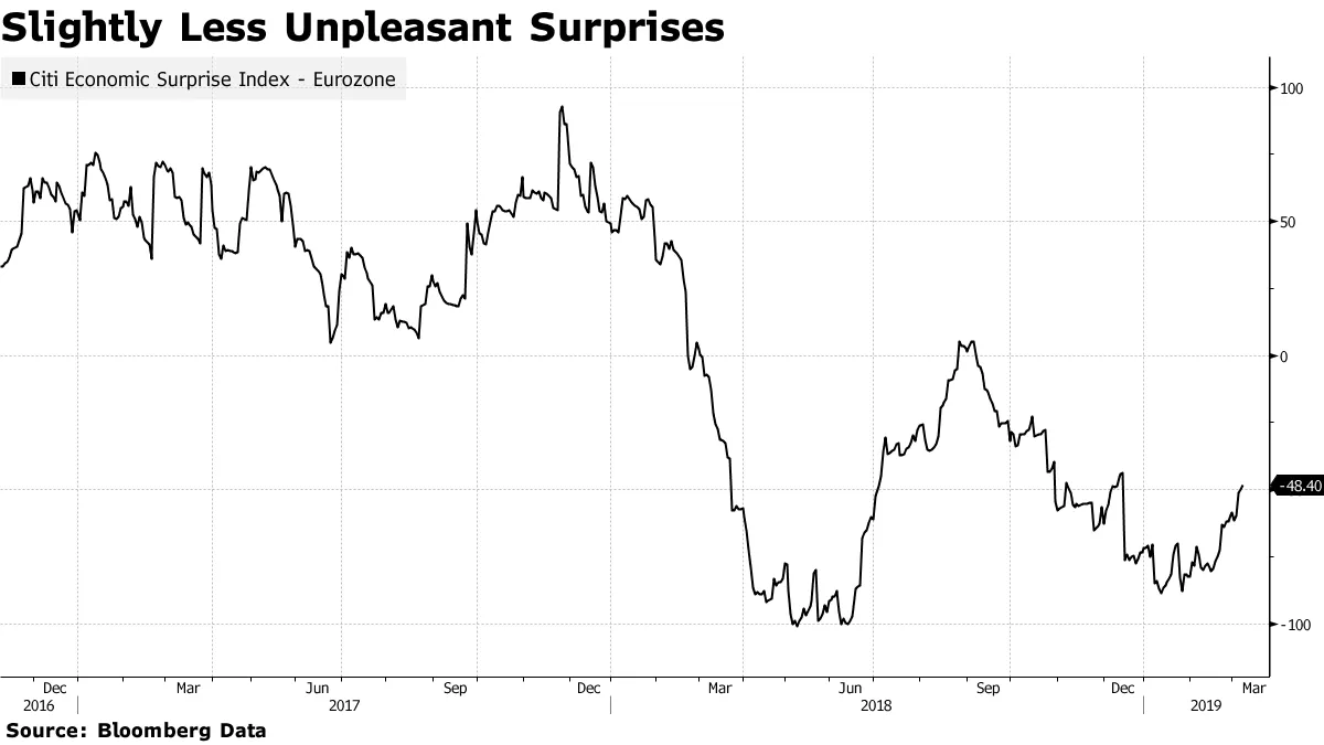 因此,很明显,市场对欧元区经济的情绪非常糟糕。但这种消极情绪是否过度,是否创造了获利的机会?直到周四,数据暗示经济学家们终于掌握了欧元区问题的程度。花旗集团的欧元区经济意外指数在2018年暴跌,今年显示出改善的迹象,这对银行来说应该是一个好兆头: