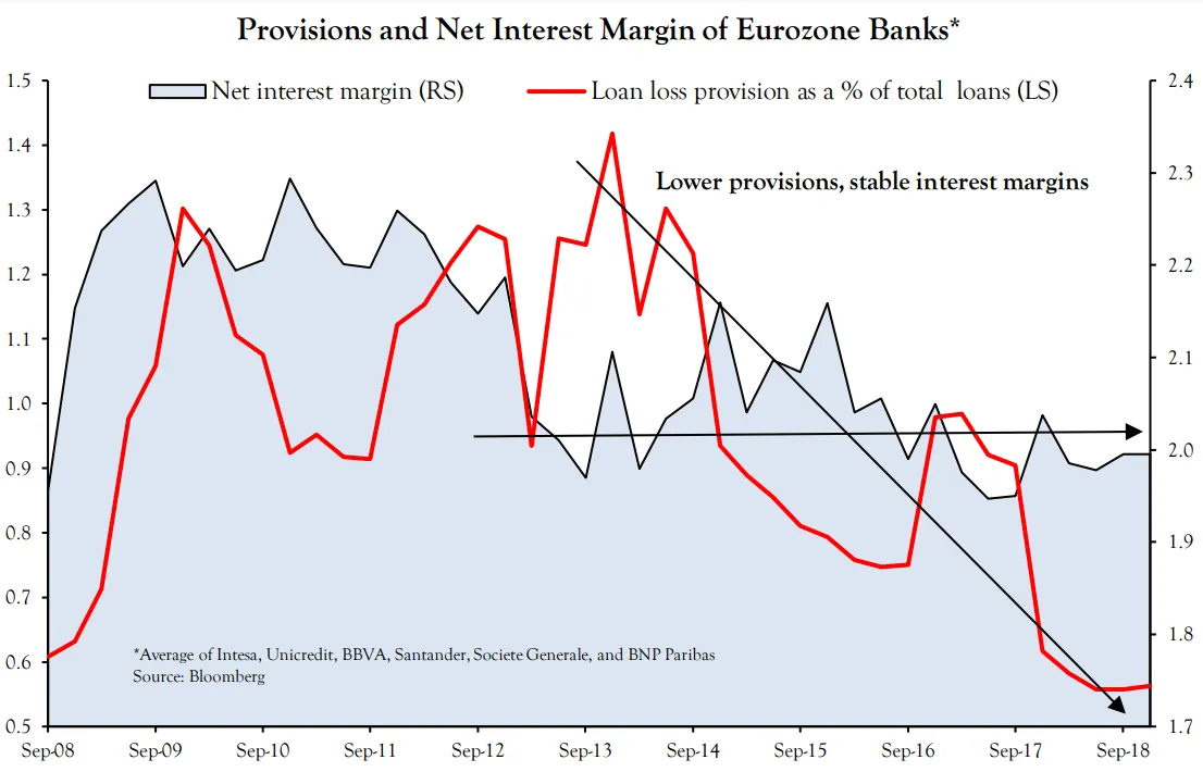 这一切并没有改变一个不可否认的事实,即欧洲银行在过去十年里一直是一个价值陷阱。它们看起来便宜,但始终未能为逆势投资者带来回报。不确定性依然很高。但如果有安全边际,它们作为价值主张可能是合理的。INTL FCStone的策略师文森特·德卢阿尔德建议,安全性来自于它们的股息,这些股息高且覆盖良好。他提供了这张图表,显示银行的净利差在不良贷款准备金下降的情况下已经稳定了五年: