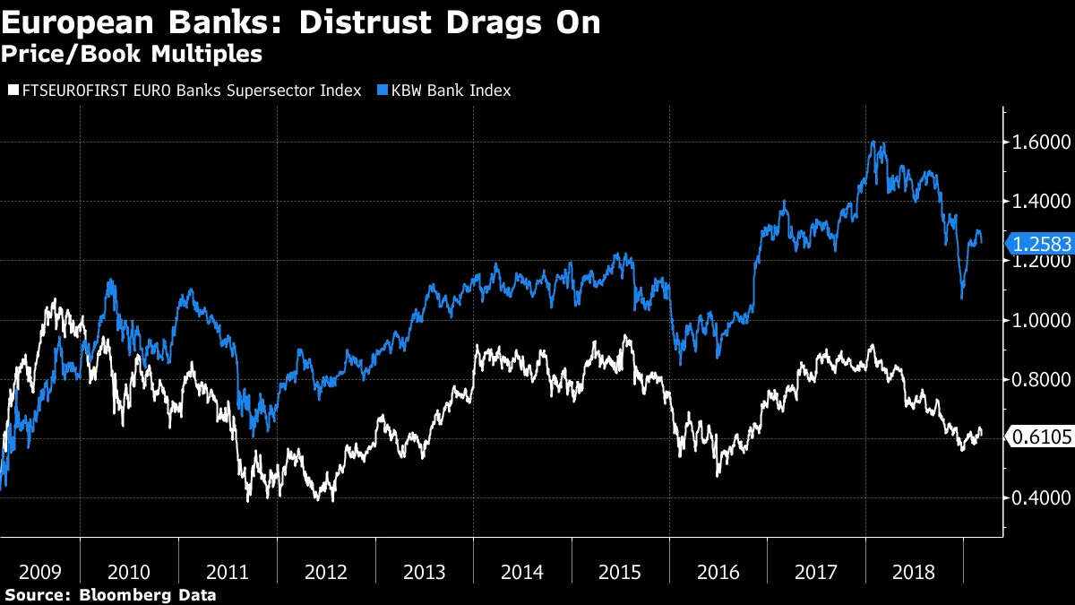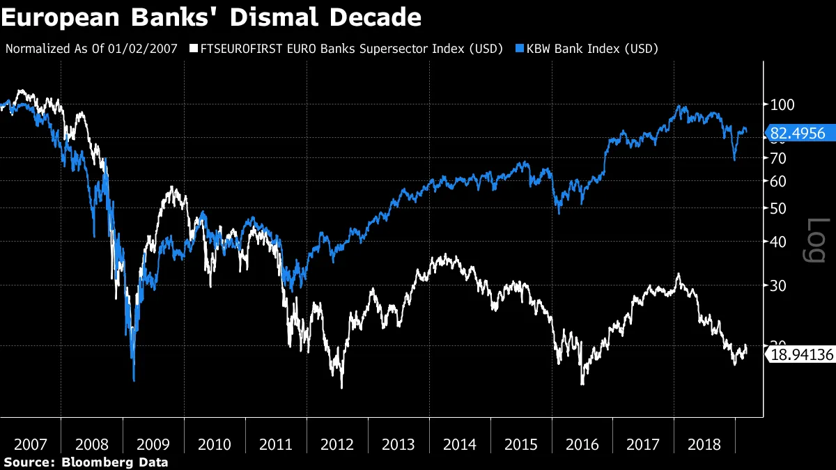 有些人真是难以取悦。欧洲的银行多年来一直承受着巨大的压力。随着金融危机时期的债务到期,欧元区经济再次放缓,这种压力最近加剧。虽然美国银行的股票大致回到了危机前的水平,但欧洲银行的股东却面临着巨大的损失:
