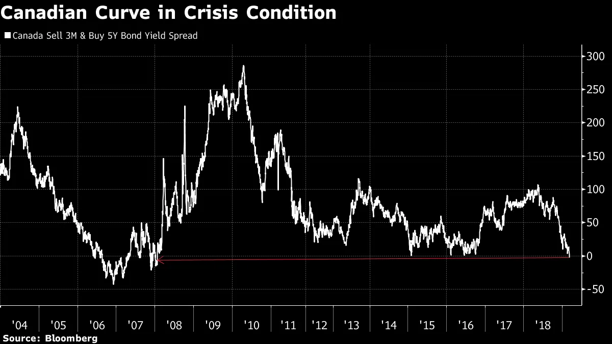 显然,交易者们在押注这不仅仅是一个绕道,而是朝相反方向的举动。三个月期国债与五年期国债之间的利差首次在金融危机以来收于负值区域。