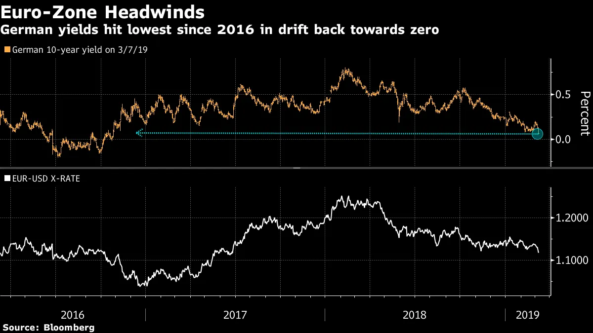 欧元跌至 20个月低点,10年期德国国债收益率降至2016年以来的最低水平。