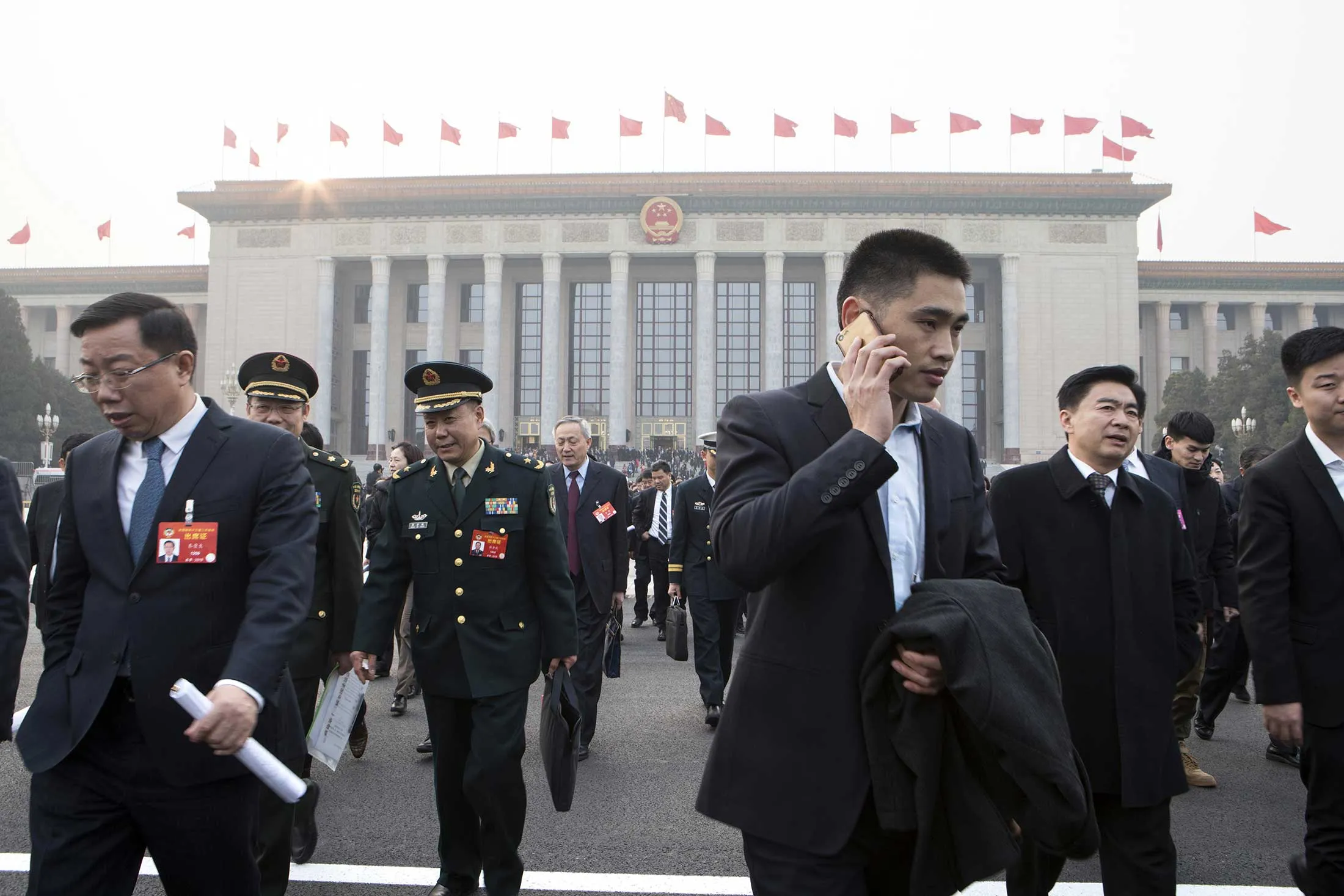 代表们在2019年3月3日第二届第十三届中国人民政治协商会议开幕后离开人民大会堂。