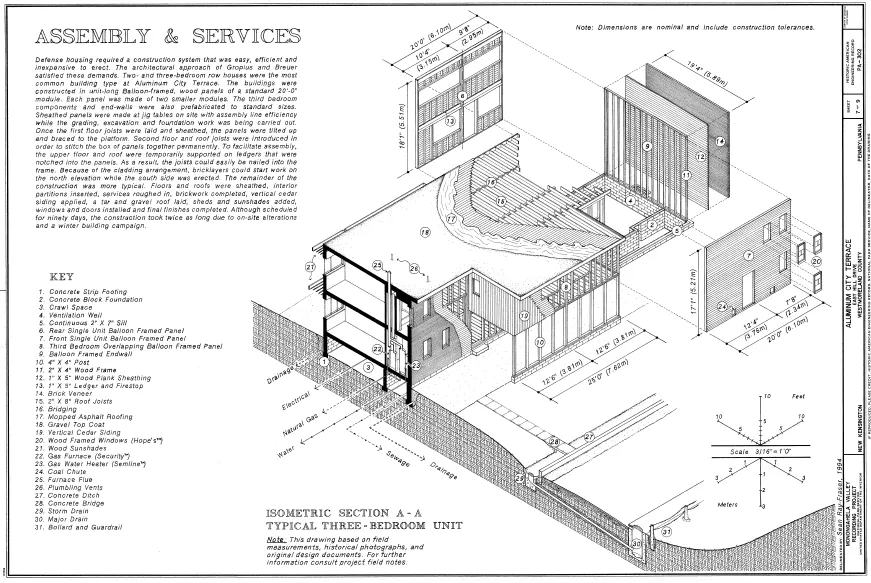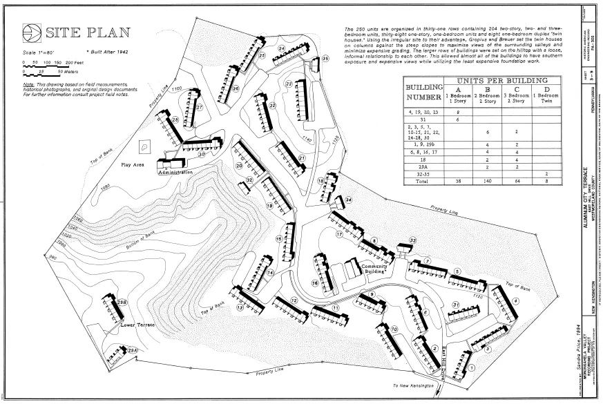 位于宾夕法尼亚州新肯辛顿的铝城露台,既独特又普通。包豪斯创始人格罗皮乌斯和他的学生转为专业伙伴的布劳尔,因各自的作品而获得了持久的声誉,但在1937年至1941年间有过短暂而卓越的合作。铝城露台是格罗皮乌斯和布劳尔在多租户住房方面的唯一共同尝试。尽管他们对将包豪斯理性主义、预制建筑和大规模住房引入美国充满兴趣,但他们主要还是生产了单户住宅的委托(包括匹兹堡的弗兰克住宅)。