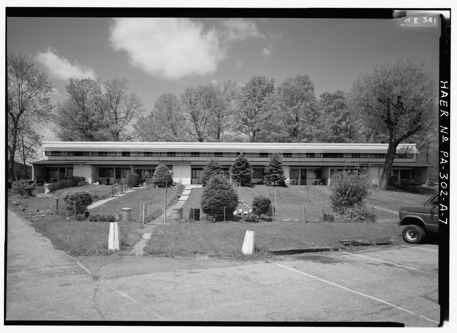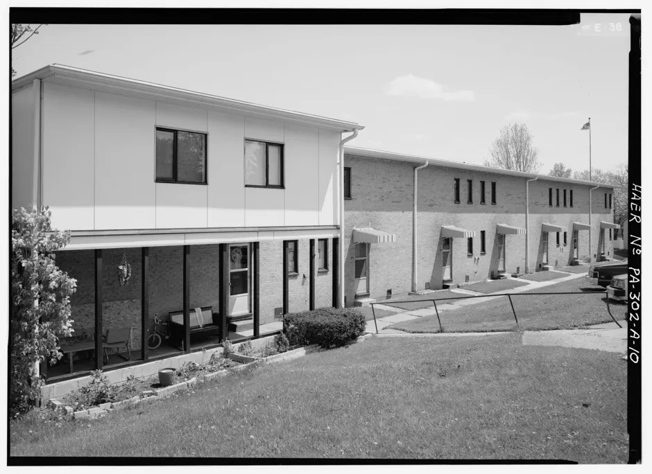尽管格罗皮乌斯和布劳尔热衷于将包豪斯理性主义、预制建筑和大规模住房引入美国,他们的合作主要产生了单户住宅的委托。铝城露台是他们在多租户住房方面的唯一共同尝试。国会图书馆位于距离匹兹堡25英里的一个磨坊小镇的陡峭山坡上,是由包豪斯大师马塞尔·布劳尔和沃尔特·格罗皮乌斯设计的美国唯一住房开发项目的一个不太可能的地点。
