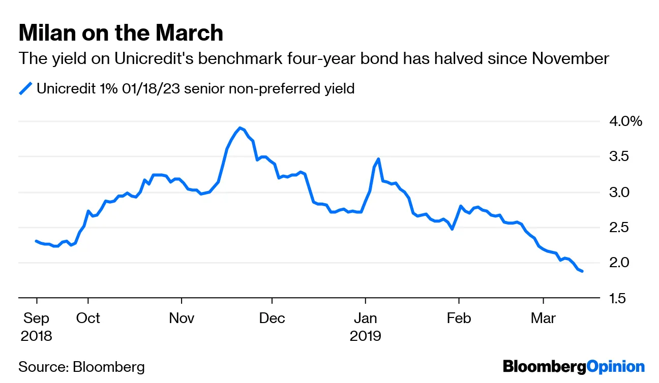 欧洲银行资本在经历了2018年最后一个季度的艰难后,今年状况更好,最明显的例子来自意大利最大的贷款机构UniCredit。根据彭博社的马库斯·阿什沃斯的说法,该银行本周的融资条件远比去年11月向Pimco出售私人债务时的条件轻松。这表明,投资者现在对该银行的信用风险和意大利的国家风险感到更加舒适。