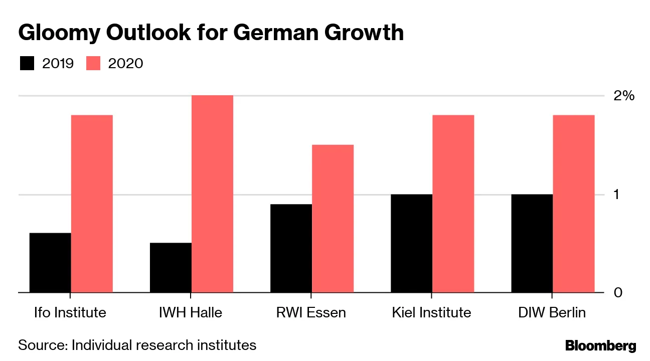 德国经济正朝着六年来最糟糕的表现迈进,Ifo研究所表示。该智库将其增长预测从之前的1.1%下调至0.6%。但这种疲软可能是短暂的:它将2020年的预测提高至1.8%,并表示今年可能会因工资增长、减税和低通胀而使消费者处于有利位置。