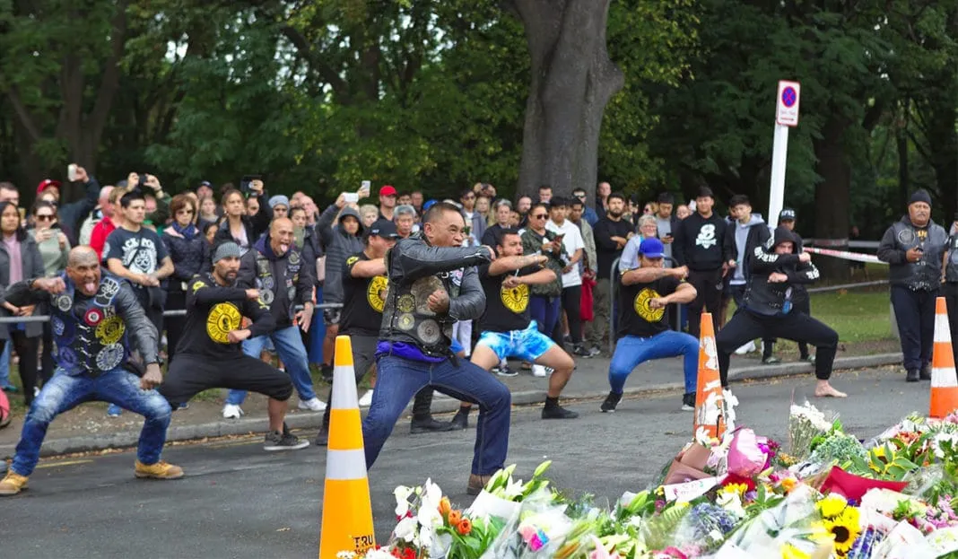 哈卡致敬。 这个新西兰摩托车帮 表演 了一种传统的毛利舞蹈,以纪念基督城清真寺袭击的受害者。