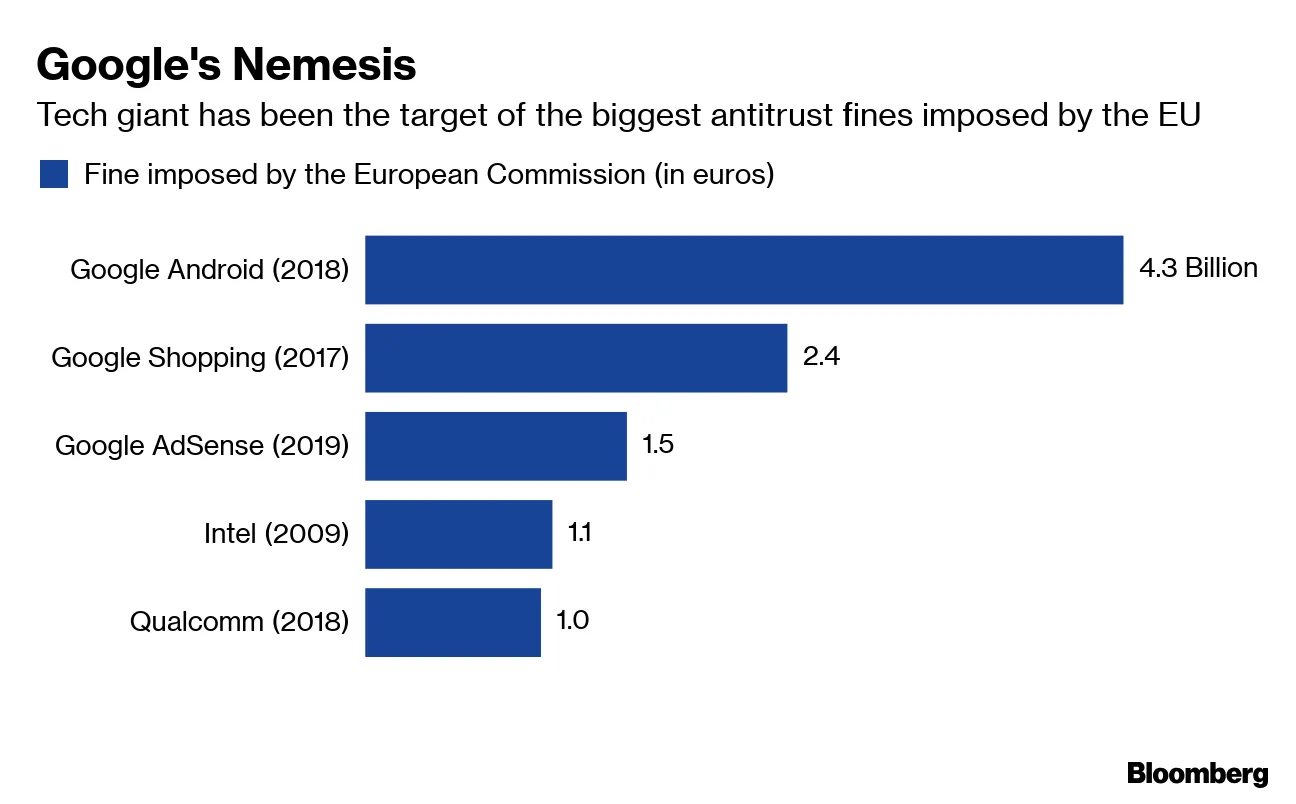 谷歌 被欧盟处以14.9亿欧元的罚款,欧盟声称AdSense搜索扼杀了在线广告的竞争。这是竞争专员玛格丽特·维斯塔格对该公司的第三次——也很可能是最后一次——攻击。谷歌已经因非法利用其Android软件和不公平地偏袒自己的比较购物服务而累计罚款67亿欧元。