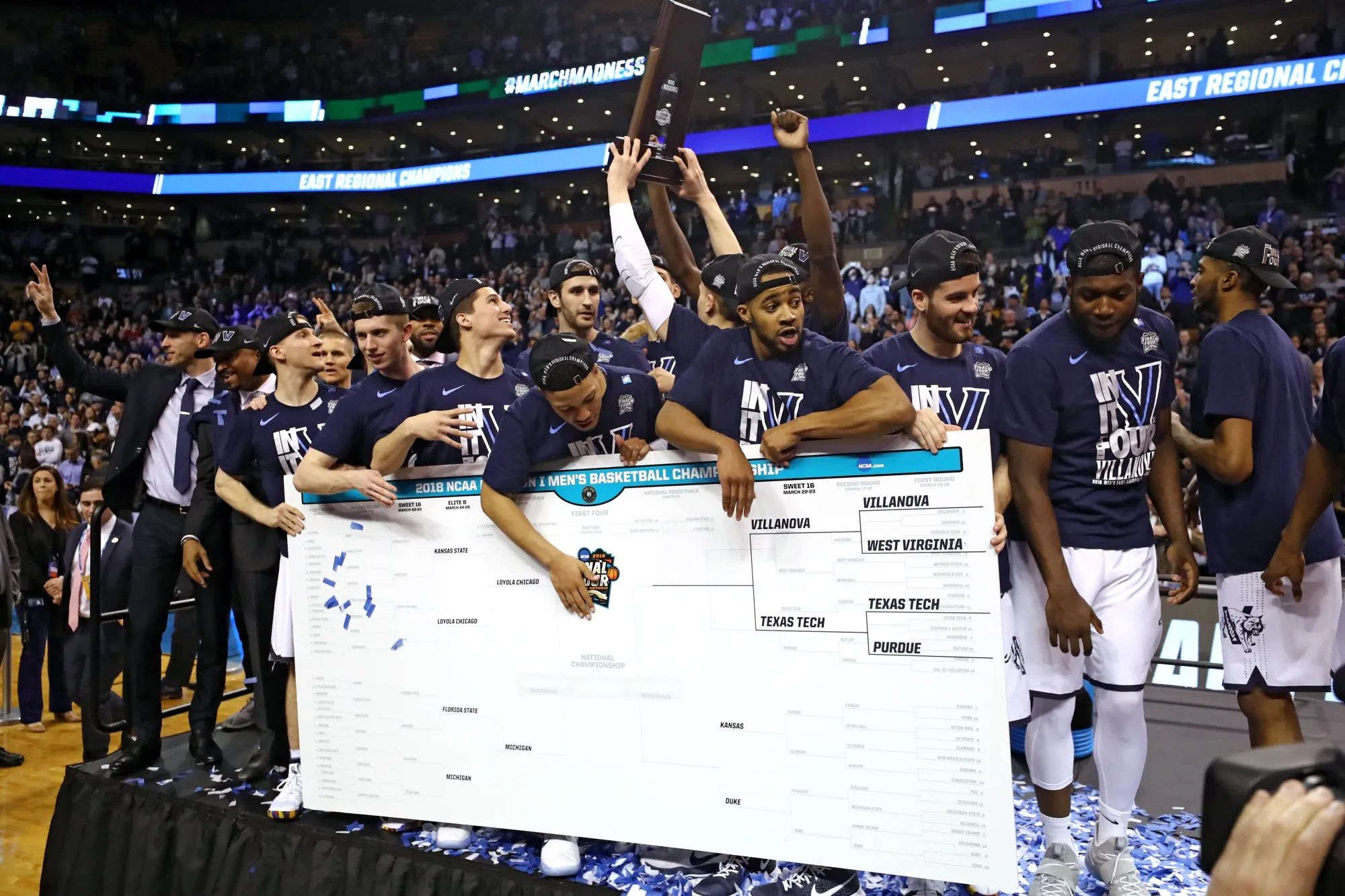 波士顿,马萨诸塞州 - 3月25日:维拉诺瓦野猫队在2018年NCAA男子篮球锦标赛东部区域决赛中以71-59击败德克萨斯科技红队后,将他们的名字加入到区域冠军的预测中,时间为2018年3月25日,地点在马萨诸塞州波士顿的TD花园。(照片由Elsa/Getty Images提供)摄影师:Elsa/Getty Images北美**感谢阅读!**请关注我们的下一期通讯,明天见。在那之前,与朋友分享TicToc今晚的内容。-安德鲁·马赫