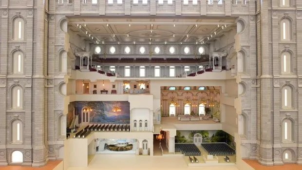 盐湖城圣殿的剖面模型,展示了仪式室和上层会议室。知识储备公司。并没有一种“摩门风格”的建筑——多年来,许多风格被用于圣殿,偶尔会向地区和前哥伦布时期的传统致敬。相反,有一些超越风格的重复特征。圣殿通常呈分层形式,像婚礼蛋糕,位于显著且缓冲良好的地点。它们往往有坚固的白色或浅色墙壁,窗户很少(或很小),有高塔或尖顶,以及一座 摩门天使摩罗尼的雕像。