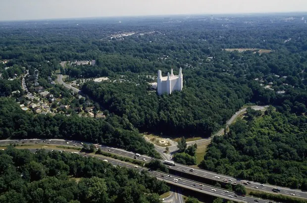 华盛顿特区寺庙在马里兰州肯辛顿的鸟瞰图,位于首都环路旁。卡罗尔·M·海史密斯/国会图书馆诸如中心城市土地高成本和需要建造附属建筑等实际考虑无疑指向了郊区地点。但摩门教领袖和建筑师们也理解一座光辉建筑的视觉力量,它比周围任何建筑都高,每天被成千上万的过路司机所看到。通过它们的位置、高度、规模和耀眼的白色,摩门教寺庙表达了一种自信的神秘感,堪比现代世界中的任何建筑。