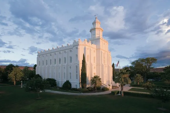 圣乔治神殿有锯齿状的墙和闪亮的白色石膏墙壁。智力储备公司。宏伟的盐湖神殿于1853年开始建造,但花费了40年才完成,空间的布局与圣乔治神殿类似,但为教会领导层设有特别的会议室。它的外部建筑是高度象征性的。布里格姆·杨指示其建筑师特鲁曼·安杰尔: