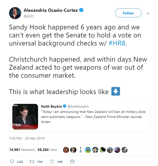 新西兰立即禁止军事风格 半自动步枪和突击步枪,并计划在上周对两座清真寺的枪击事件后进行 全国性回购 武器。枪支改革迅速成为 政府对这一悲剧的关键回应,快速的行动赢得了伯尼·桑德斯和亚历山大·奥卡西奥-科尔特斯的赞扬。