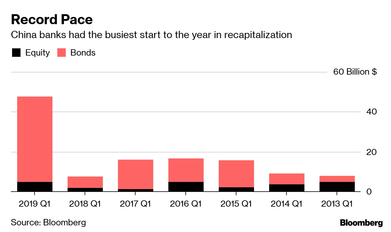 中国的银行正在创下筹资记录,急于增强其资产负债表,第一季度通过股权和债务发行筹集了480亿美元,数据由彭博社汇编。 增加资本 是银行面临的紧迫需求,因为它们在应对不良债务上升的同时,被迫帮助政府实现经济增长目标。