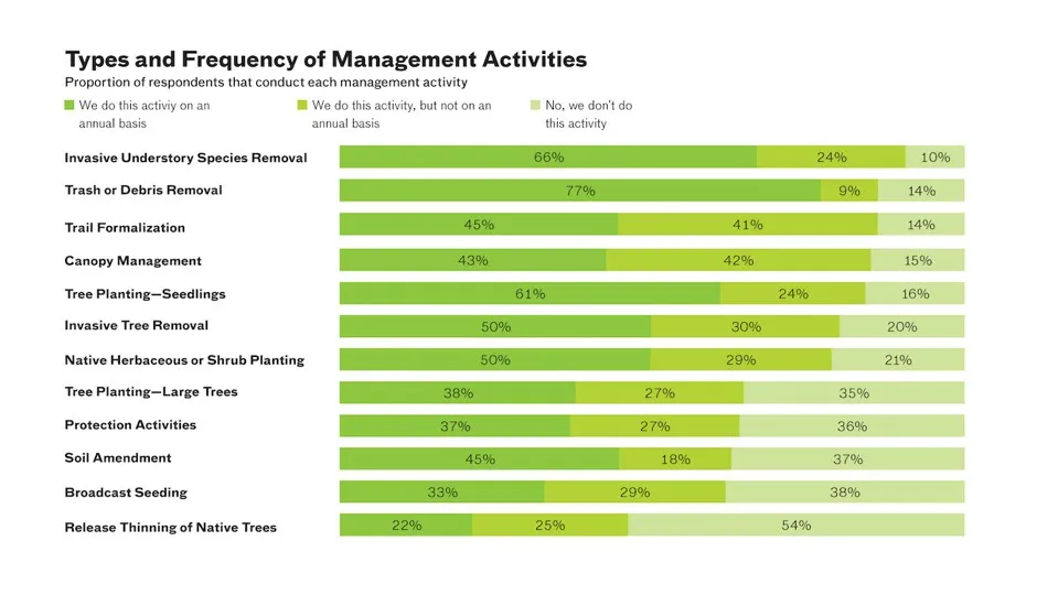总结:社会问题,如绿地访问和城市热岛效应,往往没有融入城市森林的管理中。森林管理者需要更多关于气候变化、害虫和其他因素的数据。他们需要更多的资金。而且,他们花费大量时间处理入侵物种和垃圾。