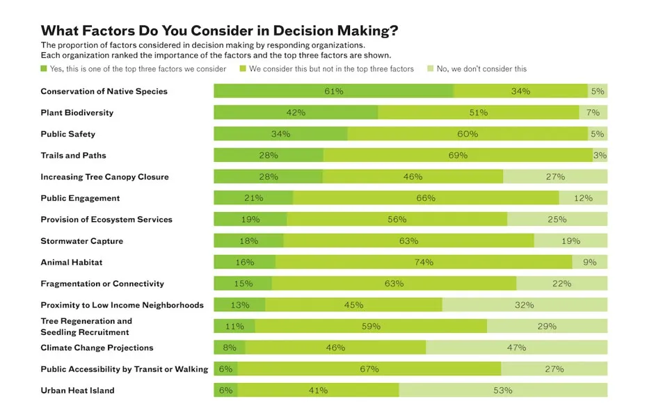 当被问及影响森林管理决策的因素时,只有一个因素被大多数受访者列为前三名:本土物种保护。生物多样性和公共安全被大量受访者列为主要因素,但对大多数人来说仍然是次要的。
