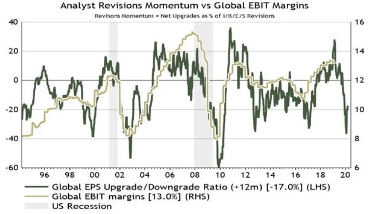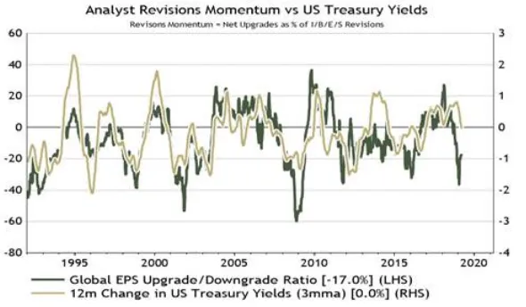 升级与降级的比例变化在美国国债收益率变化后三个月显示。这个关系相当明确;在其他条件相同的情况下,债券收益率的下降应该会导致更多的降级。基于这一点,看来我们应该看到升级数量相对于降级数量的持续下降。分析师的预测与随后的息税前收益之间也存在明显的关系(显然,较低的收益率在一定程度上应该通过降低利息成本来抵消这一点):