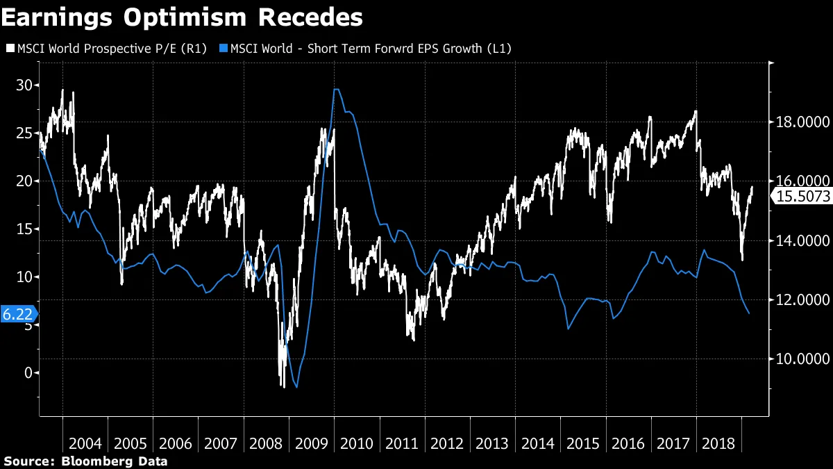 周五收益率曲线倒挂的后果——当10年期国债收益率跌破三个月期国债利率——是戏剧性的,但这并没有真正打断股票三个月来的反弹。令人瞩目的是,尽管对企业盈利的乐观情绪急剧恶化,复苏依然发生。这张图表显示了MSCI世界指数(涵盖所有发达市场)的预期盈利比率,与MSCI对与去年盈利增长相比预期增长的衡量标准相比。这两个指标历史上是一起波动的,但在2015年发生了变化,当时尽管对利润持悲观态度,股票仍然上涨。而现在,这种情况再次发生。