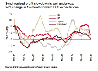 疲弱的盈利动能是一个全球现象。预计的盈利增长在全球范围内放缓甚至下降,正如这张来自法国外贸银行量化团队的图表所示: