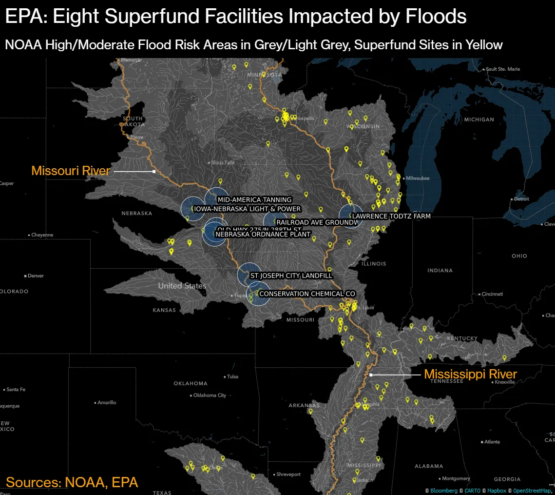 新的危险。 美国中西部的重大洪水已达到至少八个超级基金场地,涉及三个州,这使得环保局工作人员无法确定是否有任何场地因而泄漏有毒化学物质。