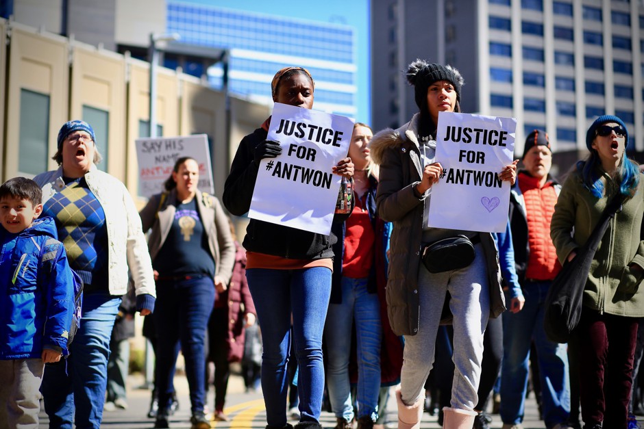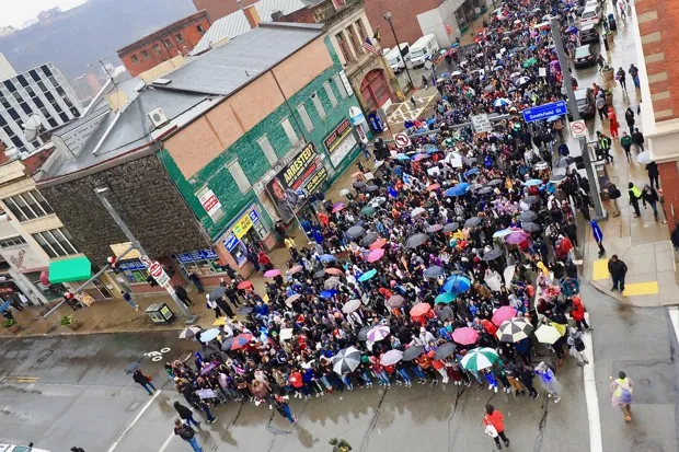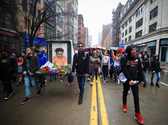 大约一千名高中和大学学生走出课堂,游行抗议杀害安特万·罗斯二世的警察的无罪释放。照片由埃马伊·阿拉奎瓦提供自从罗斯费尔德上周五晚被宣判无罪以来,匹兹堡大区,包括市中心、审判举行的法院外以及东自由,一个非正式划定为再开发中心的社区,发生了几次街头抗议。昨天,超过1,000名高中和大学学生在城市游行,抗议罗斯费尔德的无罪释放,呼喊安特万·罗斯二世的家庭没有得到公正。再次,社会媒体上对不公正的地点和位置进行了武器化,人们强调是位于宾夕法尼亚州中部的道芬县陪审团宣判罗斯费尔德无罪,而不是位于东匹兹堡和匹兹堡的阿勒格尼县陪审团。