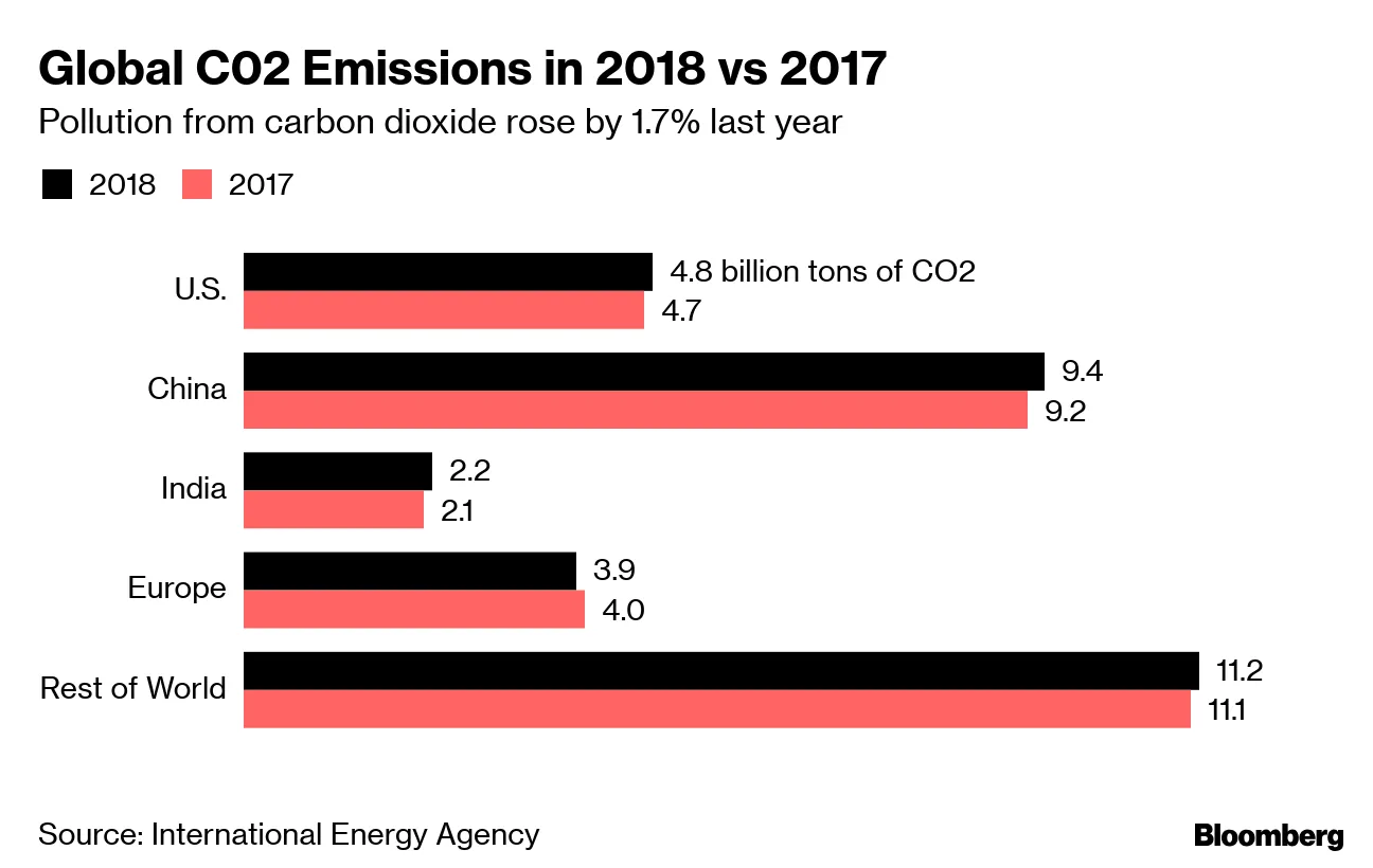 美国、中国和印度推动全球二氧化碳排放来自化石燃料的去年创下新纪录,根据国际能源署的数据。彭博碳时钟显示,大气中的二氧化碳水平接近413个百万分之一,比工业化前高出约48%。