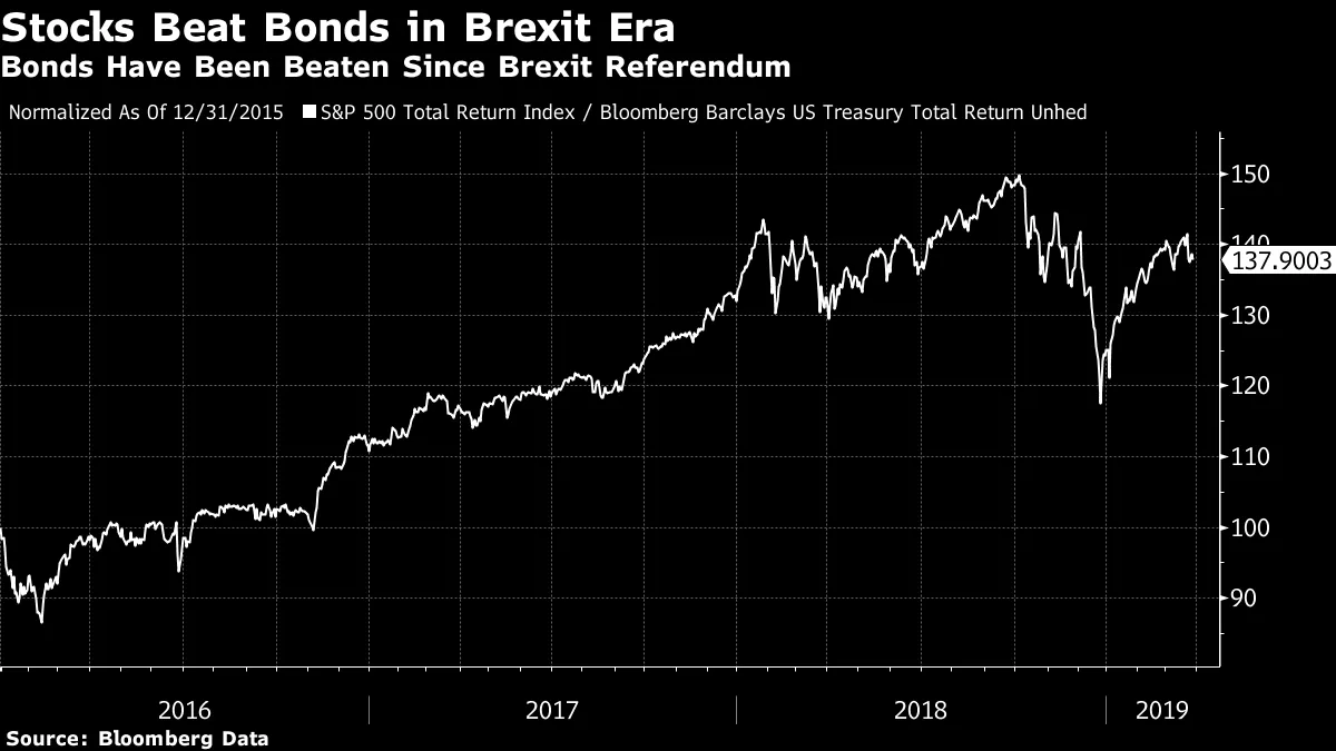 然而,这次情况有所不同。这不再是经典的避险行为。相反,这是对未来利率和经济增长前景看法的重大转变。正如彭博新闻的卡梅伦·克里斯指出,收益率低时,债券在资本回报基础上的损失风险增加。与此同时,自公投以来,英国脱欧的兴奋并没有阻止股票在这些年里显著超越债券。公投后的时代对资产配置者来说是充满乐观的。