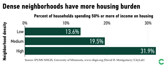 但是,严重住房负担社区的真正中心在国家地图上可能很难看到,因为它们在地理上很小:城市地区。这是由于住房压力的恶性特性。虽然贫困家庭绝对更可能将大部分收入用于维持住房,但这不仅仅是关于贫困。住房负担是收入和成本的函数。低收入和高成本的交汇点往往发生在财富位于贫困附近时——而这在美国的城市中最为常见。